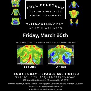 Danielle Benham with Full Spectrum Health & Wellness with be at Soul Wellness taking appointments for thermography. The best thermal camera in NORTH CAROLINA is at FSHW – the FLIRA500, which quickly detects and visualizes heat on the surface of the skin. FSHW offers imaging for breast, head, upper body, abdomen, lower body, and extremities. […]