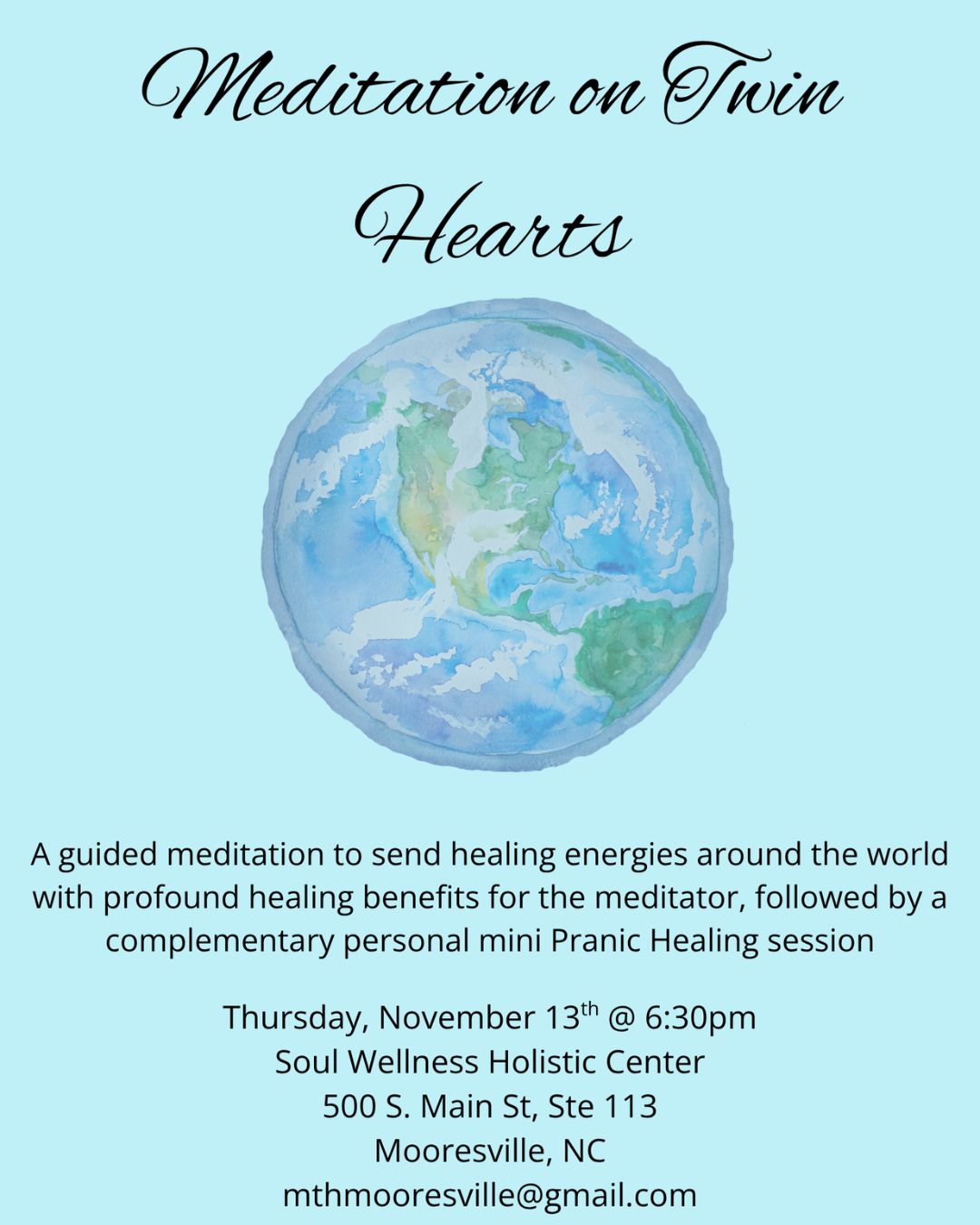 Complimentary, personal mini healings will be offered immediately after the Twin Hearts Meditation.